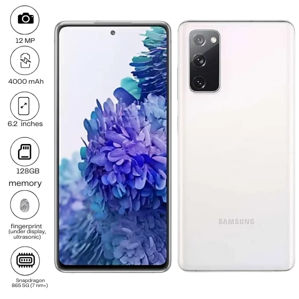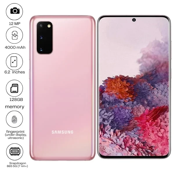 The Samsung Galaxy S20 5G features a 6.2-inch 1440x3200 pixel display for immersive visuals and a powerful 64MP camera with 8K video recording. It is equipped with a 4000mAh battery supporting 25W wired and 15W wireless charging. Experience smooth performance with 5G connectivity.